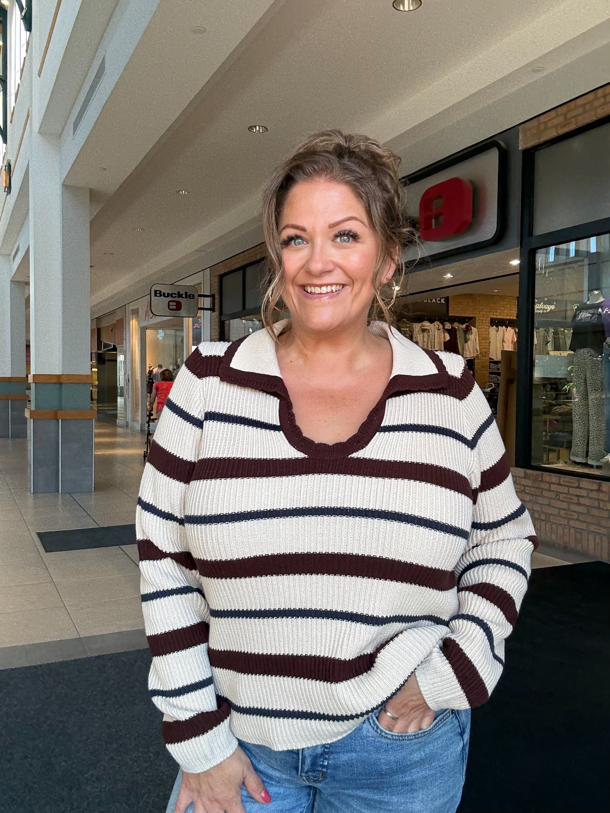 Cozy up in the Autumn Brew Sweater, where classic stripes meet a playful collared twist. Perfect for layering or wearing on its own, this sweater adds a fun dash of charm to your fall wardrobe while keeping you comfy and stylish all season long.