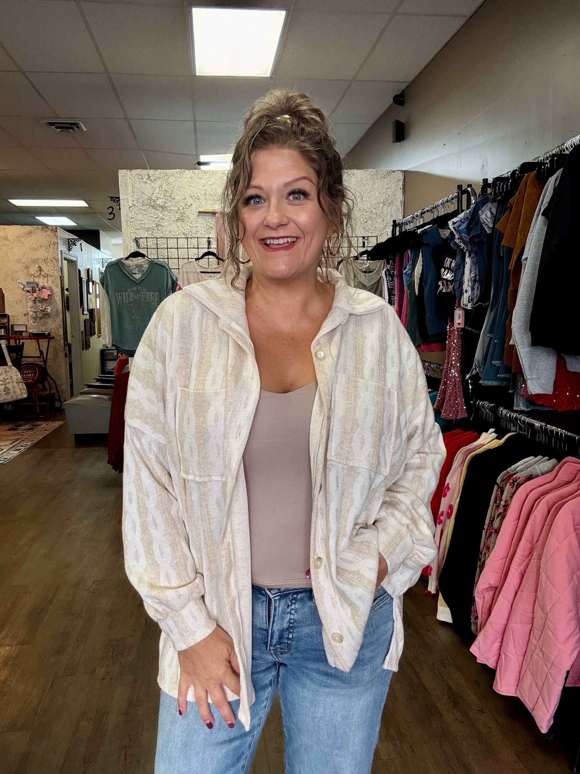 Wrap yourself in cozy charm with our Cable Jacquard Shacket! Perfect for layering, this playful blend of jacket and shirt features a textured cable pattern that adds personality to any outfit. Whether you're heading out for a casual stroll or meeting friends for coffee, its soft fabric and relaxed fit keep you comfy and stylish all day long. Embrace fun, warmth, and effortless cool in one. Runs super generous Rachael’s wearing a small.