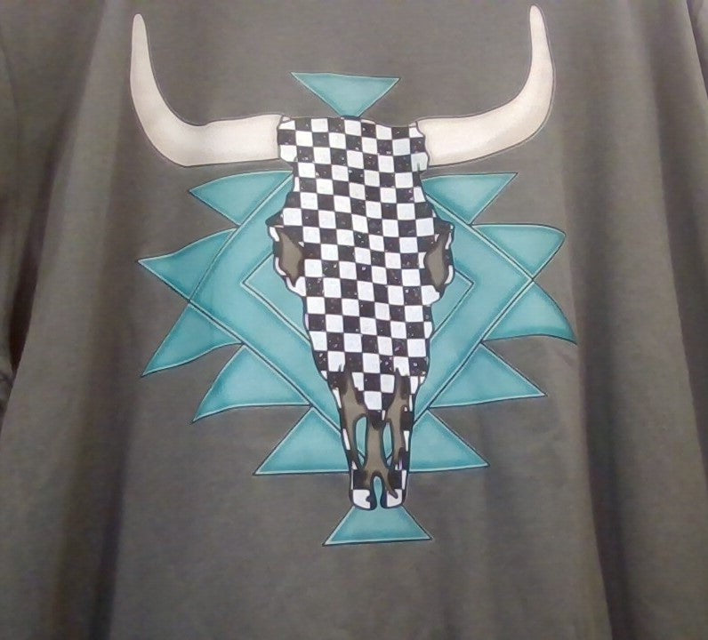 Show off your wild side with this gray Bella tee featuring a bold checkered bull skull design. Perfect for adding a touch of edgy fun to your casual wardrobe, this tee combines comfort with a playful statement. Whether you're out with friends or just chilling, it’s sure to turn heads and spark conversations.