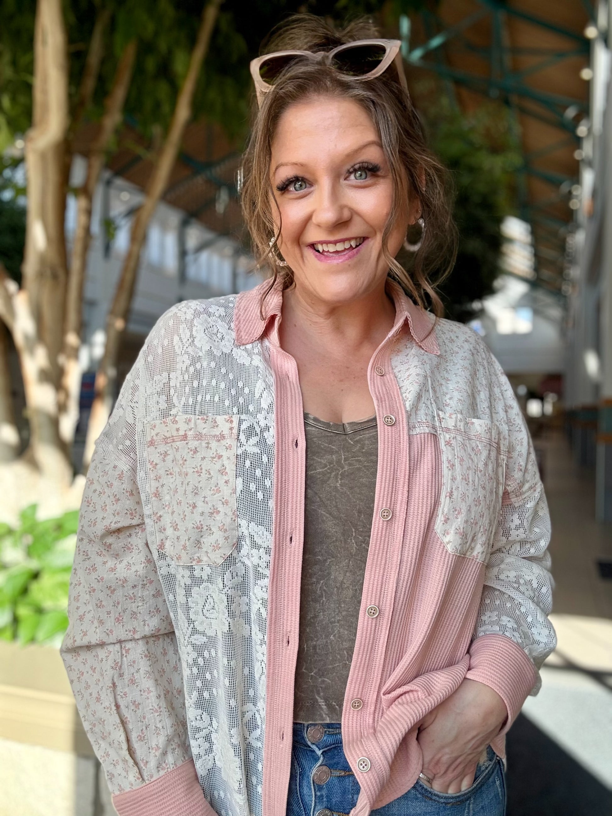 Contrast Ribbed Knit & Lace Shacket Jacket