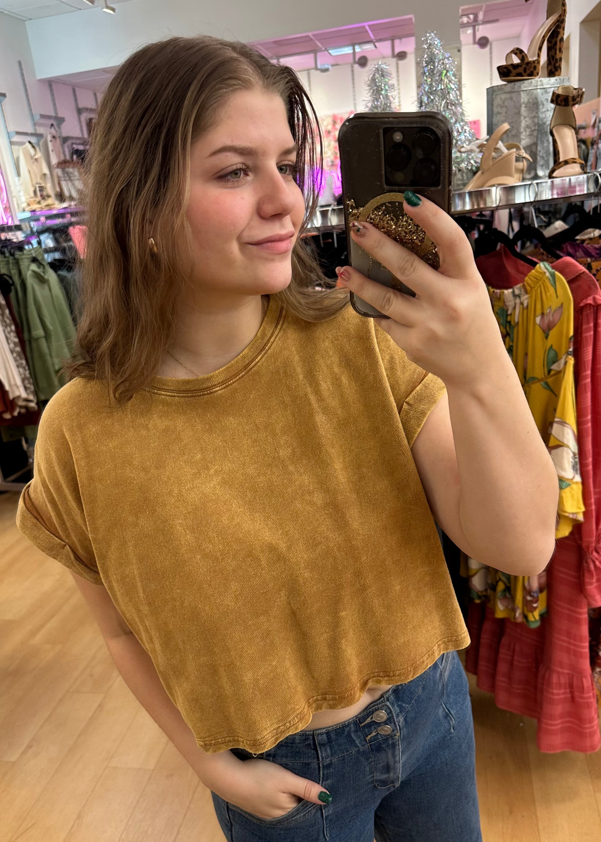 This cropped acid wash tee packs a punch of personality with its unique acid wash design. Its perfect fit will keep you comfortable and confident all day long. Rock this trendy tee with any bottoms for an effortlessly cool look.