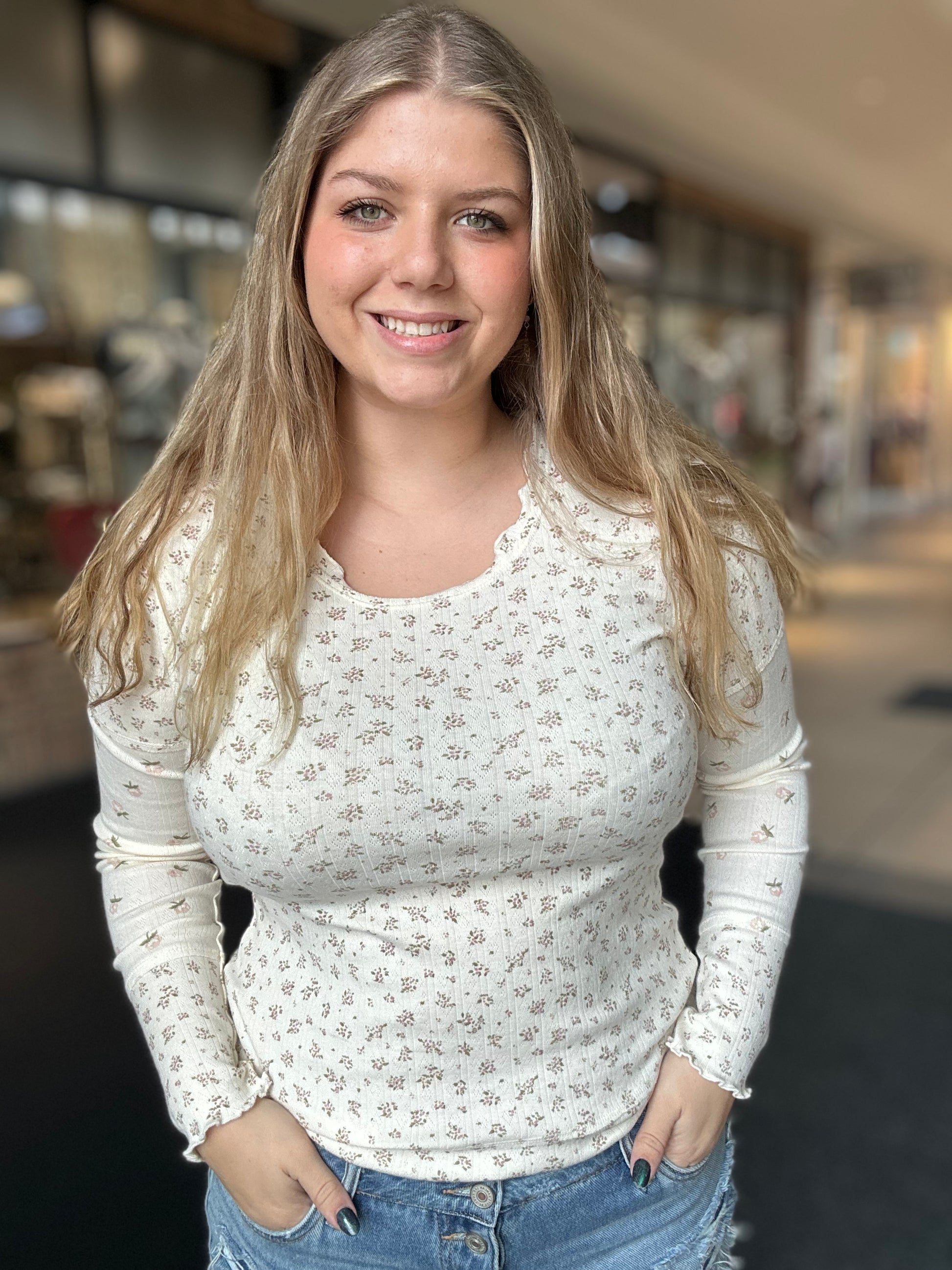 Brighten your wardrobe with this Floral Printed Lettuce Hem Fitted Knit Top. Its playful floral pattern pairs perfectly with the delicate lettuce-edge hem, adding a flirty twist to a snug, comfortable fit. Ideal for days when you want to feel fun and feminine while staying effortlessly chic.