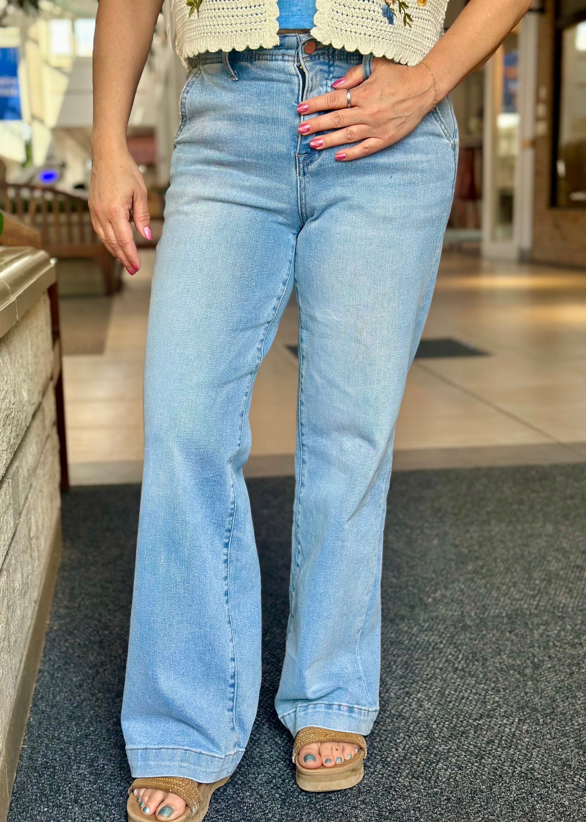 Introducing our High Rise Wide Leg W/ Slant Pocket pants, the perfect blend of style and comfort. With a high rise waist and wide leg fit, these pants are ultra-flattering and on-trend. Plus, the slant pockets add a touch of convenience. Upgrade your wardrobe with these versatile and chic pants!