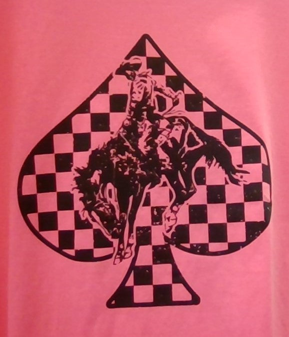 This hot pink tee features a playful cowboy graphic set inside a bold checkered spade, adding a fun twist to your casual wardrobe. Made from soft Comfort Colors fabric, it offers all-day comfort with a vibrant pop of color that’s perfect for standing out. Whether you're heading to a rodeo or just want to add some western flair to your look, this tee brings a spirited vibe to any outfit.