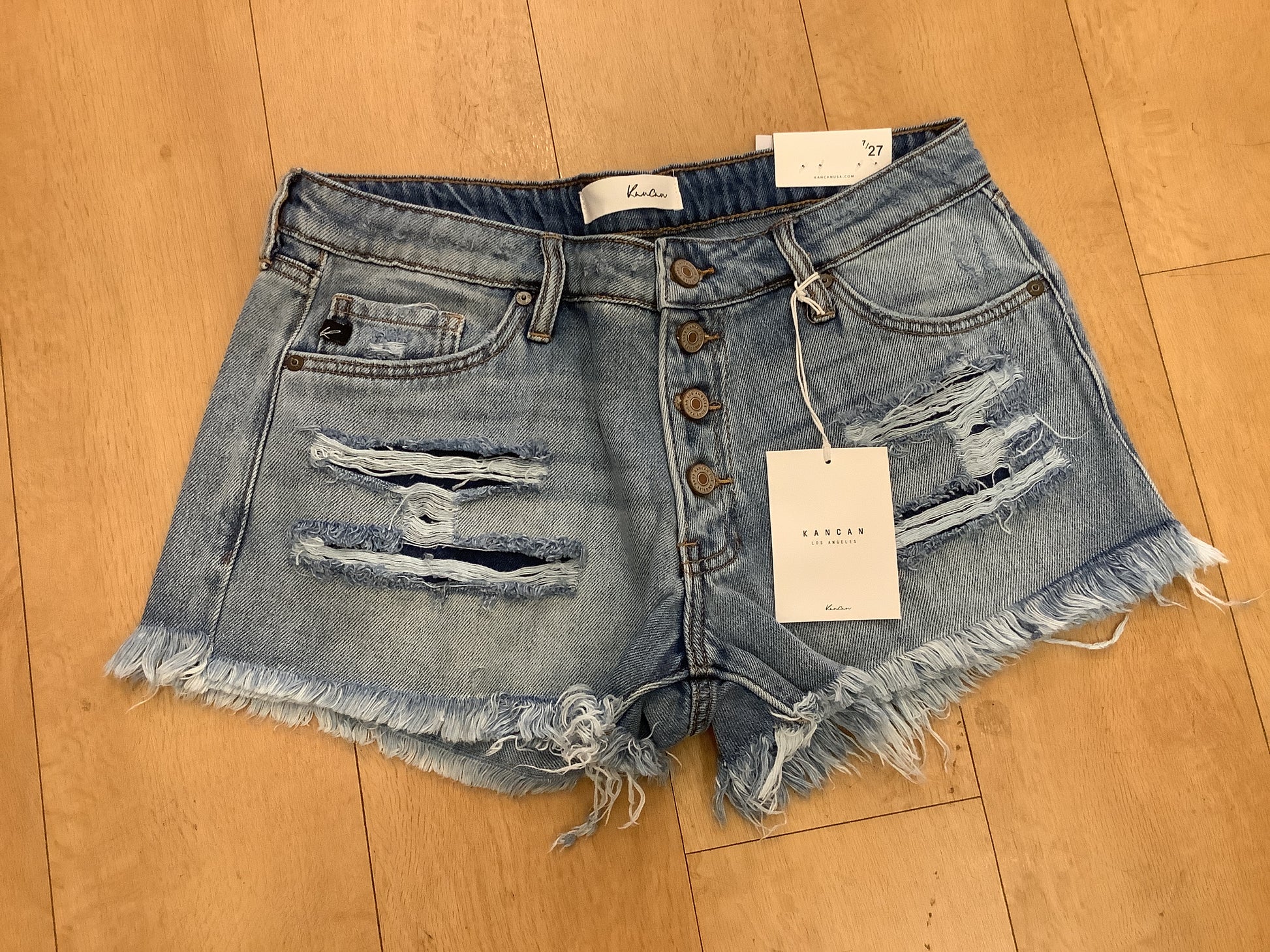 "Expertly crafted with a mid-rise fit and distressed details, our Kancan Jean shorts offer both style and comfort. Made with high-quality denim, these shorts are perfect for any summer day. Plus, the mid-rise fit provides a flattering silhouette. Upgrade your wardrobe with these versatile and trendy shorts."