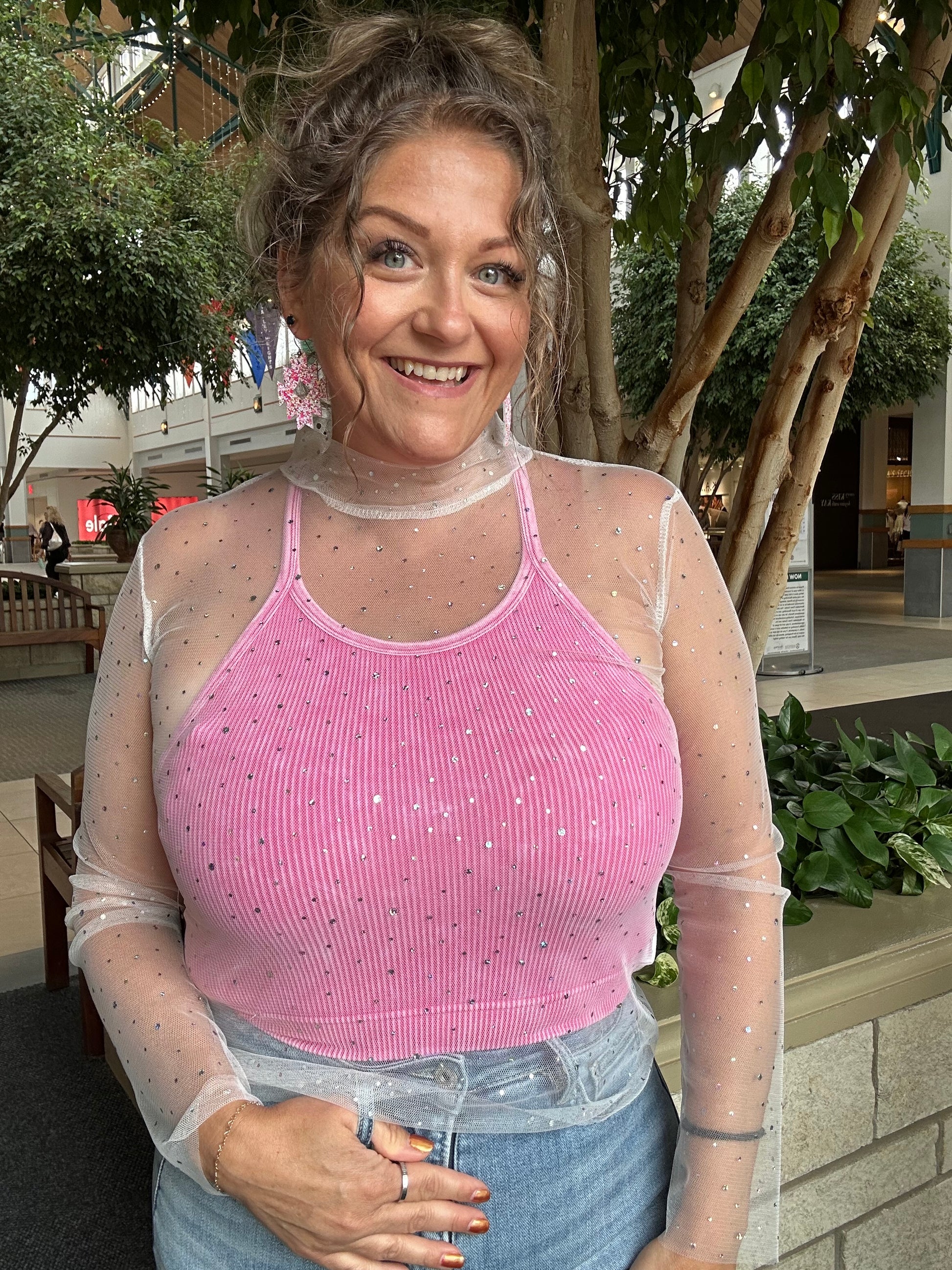 Layer up with this Mock Neck Sheer Long Sleeve Top. Its delicate and sheer design adds a touch of elegance to any outfit. Perfect for those who want to spice up their wardrobe with some playful layering. Stay stylish without taking yourself too seriously.