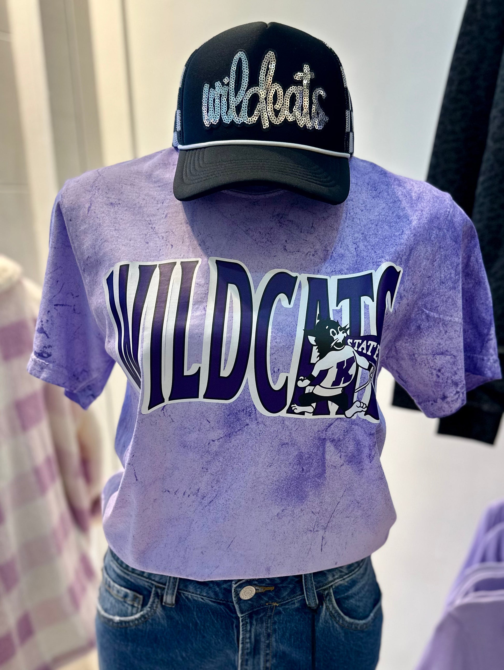 Short sleeve purple acid wash T-shirt with WILDCATS and willie
