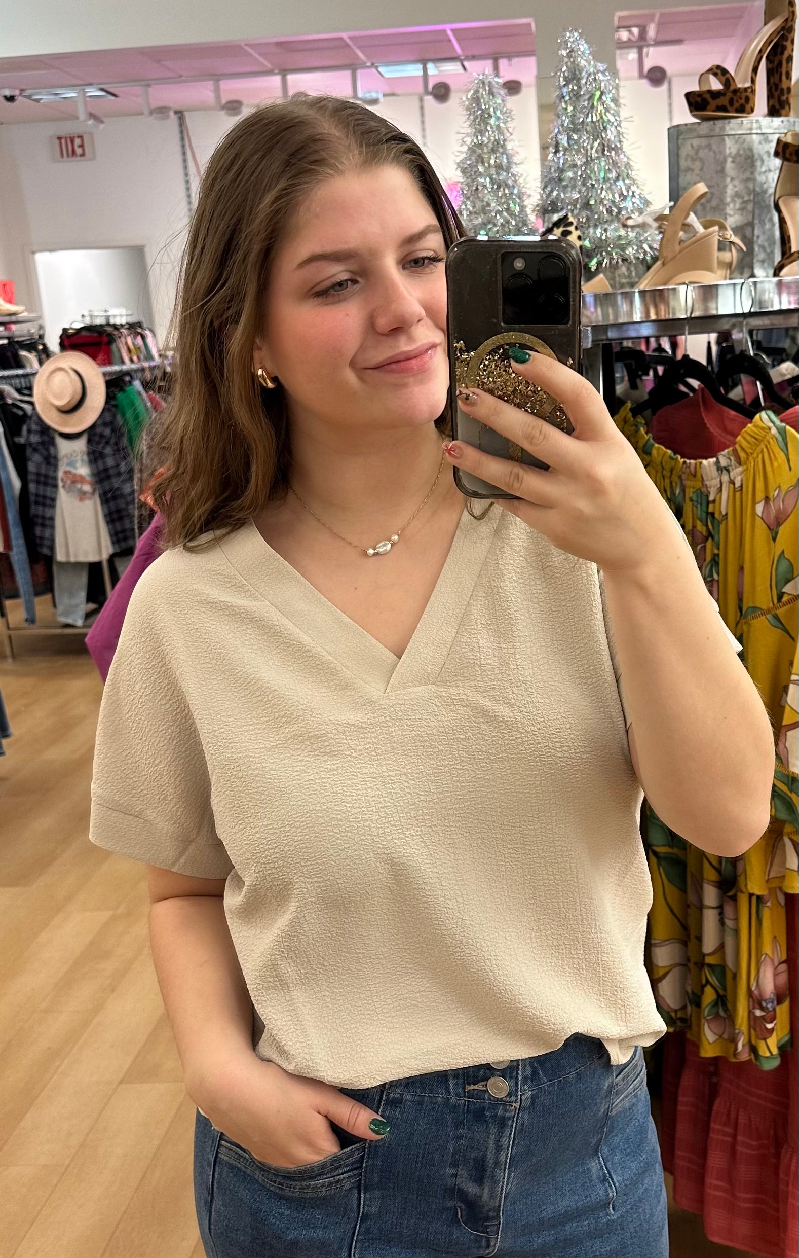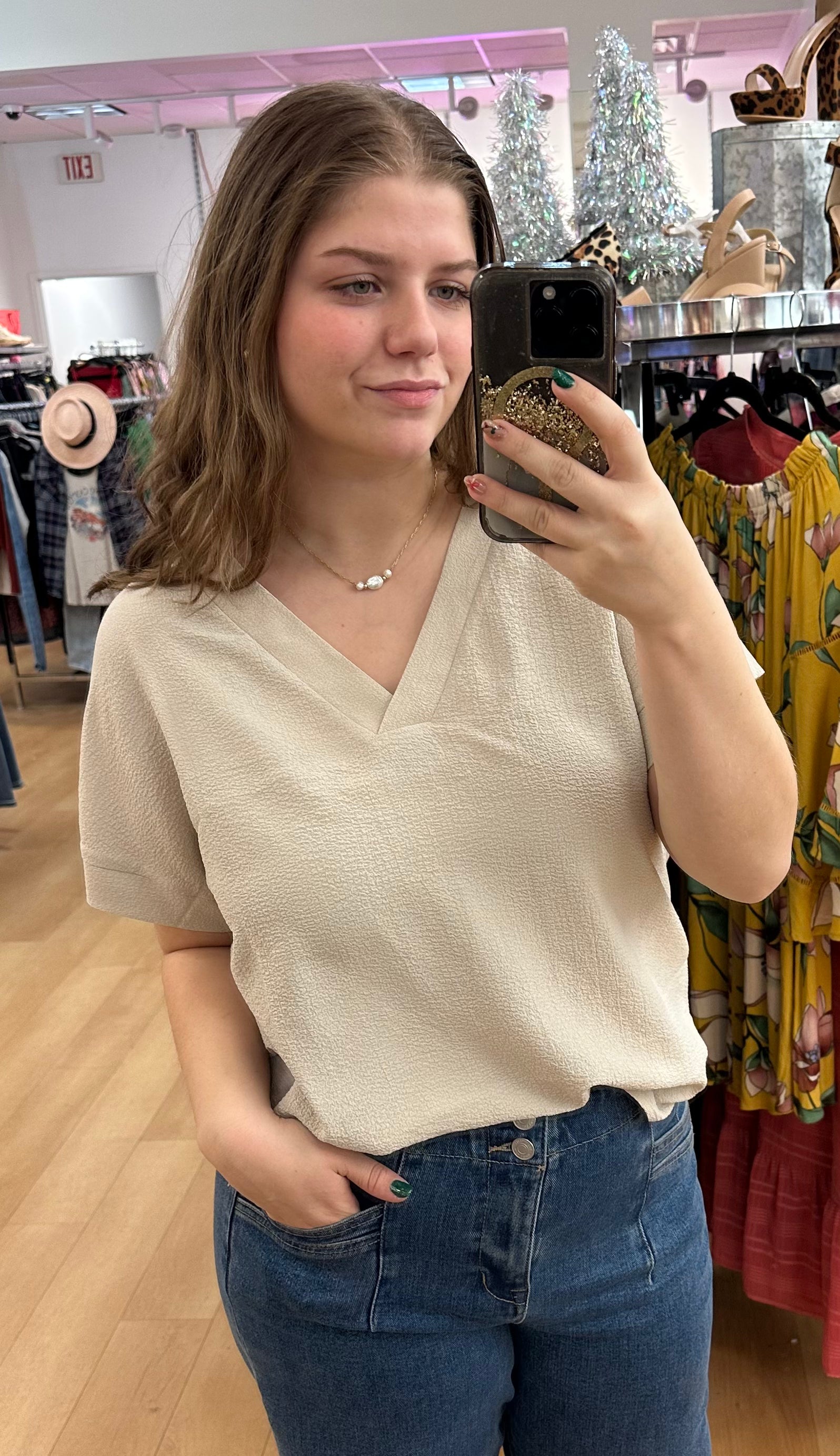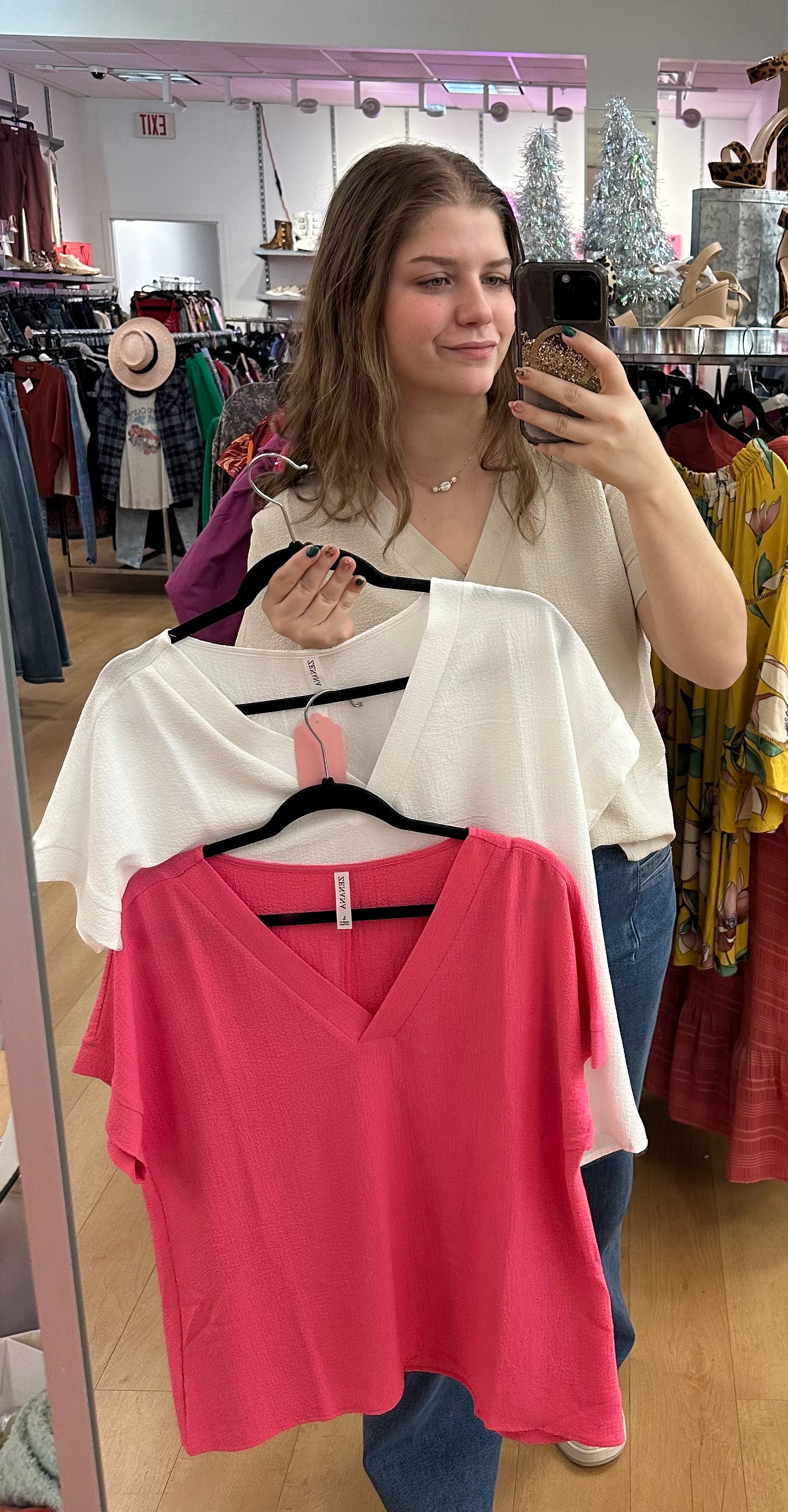"Unleash your inner fashionista with our Textured V-Neck Blouse! Available in three stylish colors, this perfect blouse will elevate any outfit. Get ready to turn heads and make a statement in this must-have piece. Don't miss out - get yours today!"