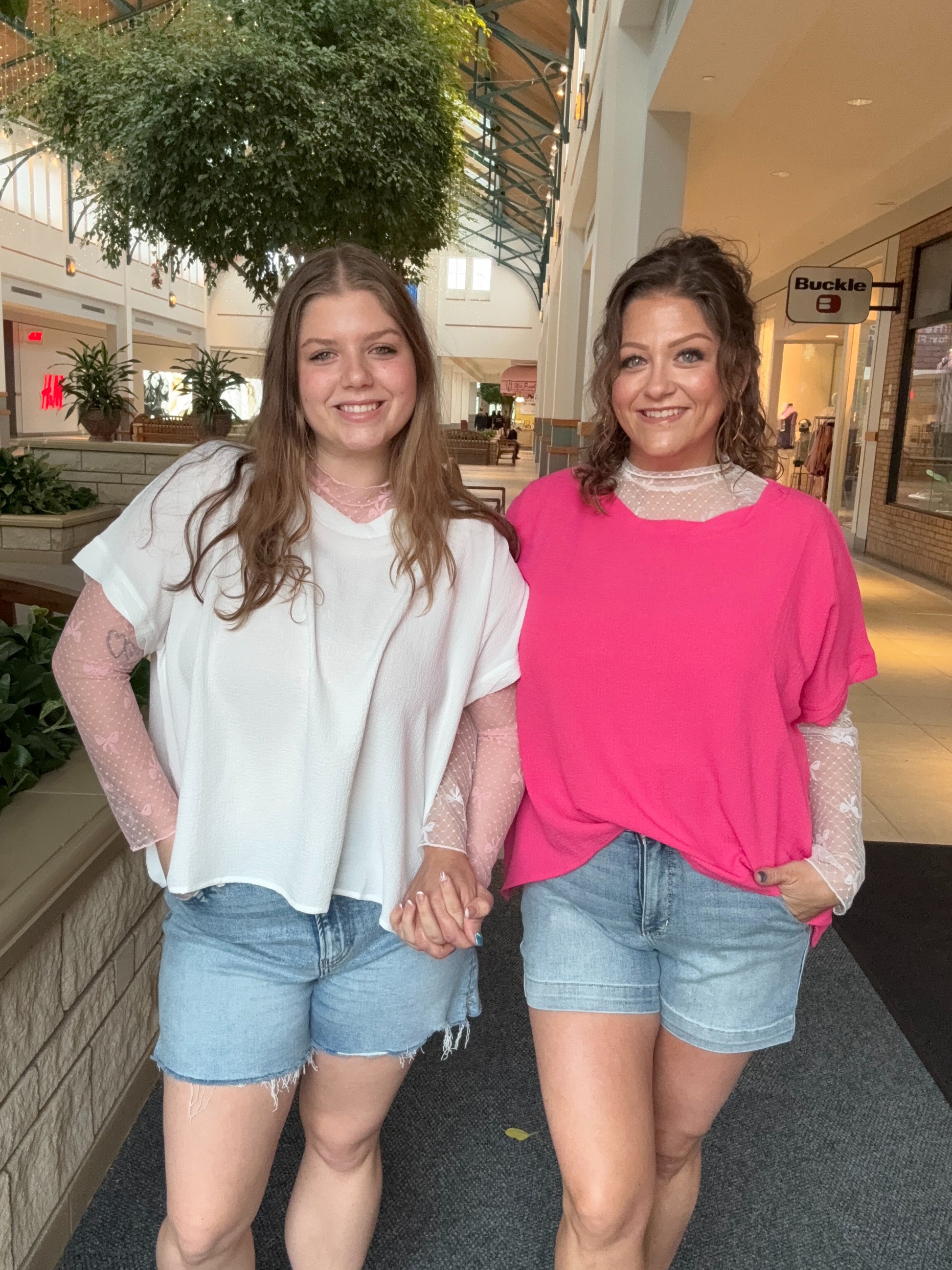 Breathe easy (quite literally) in this airy, woven bubble airflow top. A round neck and short sleeves make for a classic silhouette with a twist. Perfect for staying cool and stylish on a hot day. (No sweating, only swooning allowed.). Runs really generous we are sized down 1 but you could easily size down two.