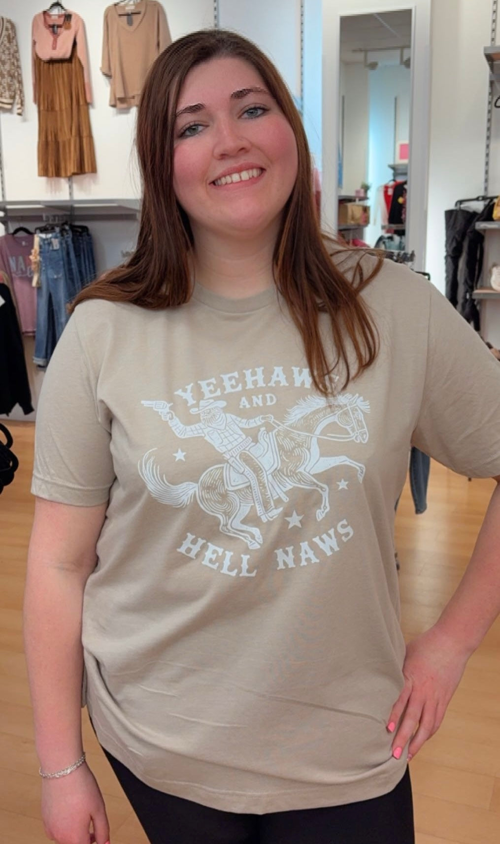This YEEHAWS and HELL NAWS tee is perfect for any Western enthusiast. Made with high-quality material, it features a stylish design and comfortable fit. Show your love for the Wild West in a fun, stylish way with this tee.